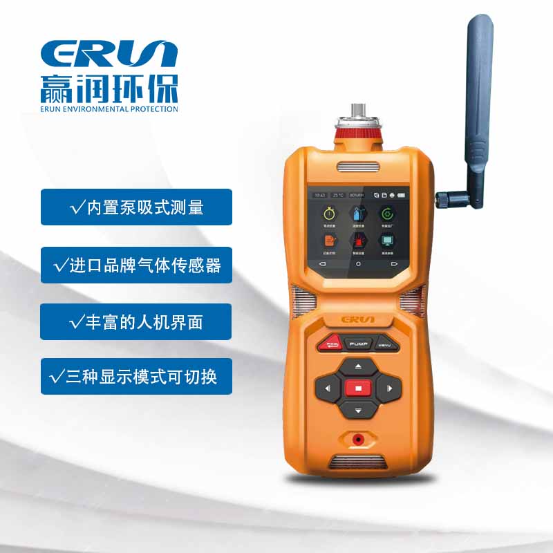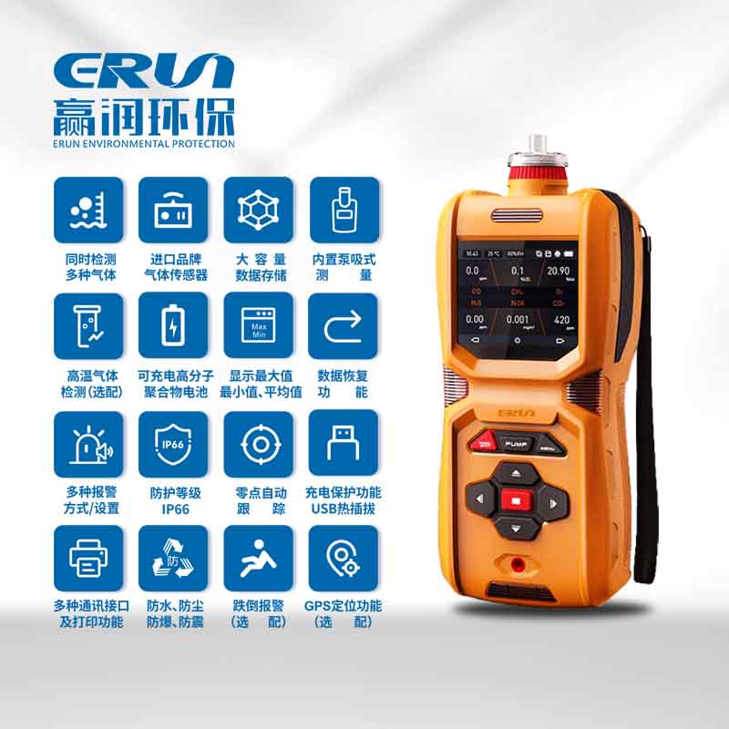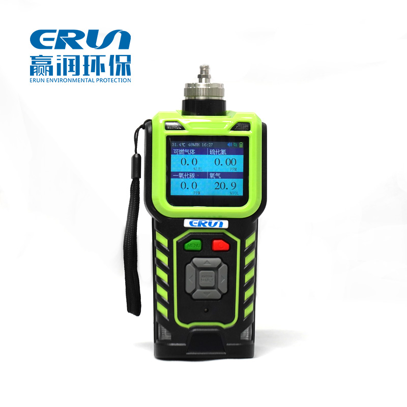 贏潤環保研發、生產的手持式泵吸型六合一多參數氣體報警儀ERUN-PG71S6可同時檢測氧氣、甲烷、硫化氫、一氧化碳、二氧化碳、氮氧化物或其他可燃有毒氣體,也可以配備溫度、濕度測量,檢測氣體種類超過500余種。